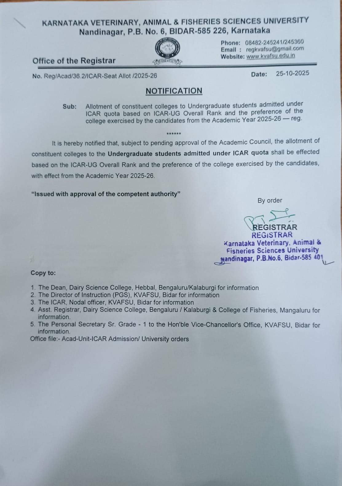 Notification ICAR UG Provisional Admission List 2025-26 ![]()