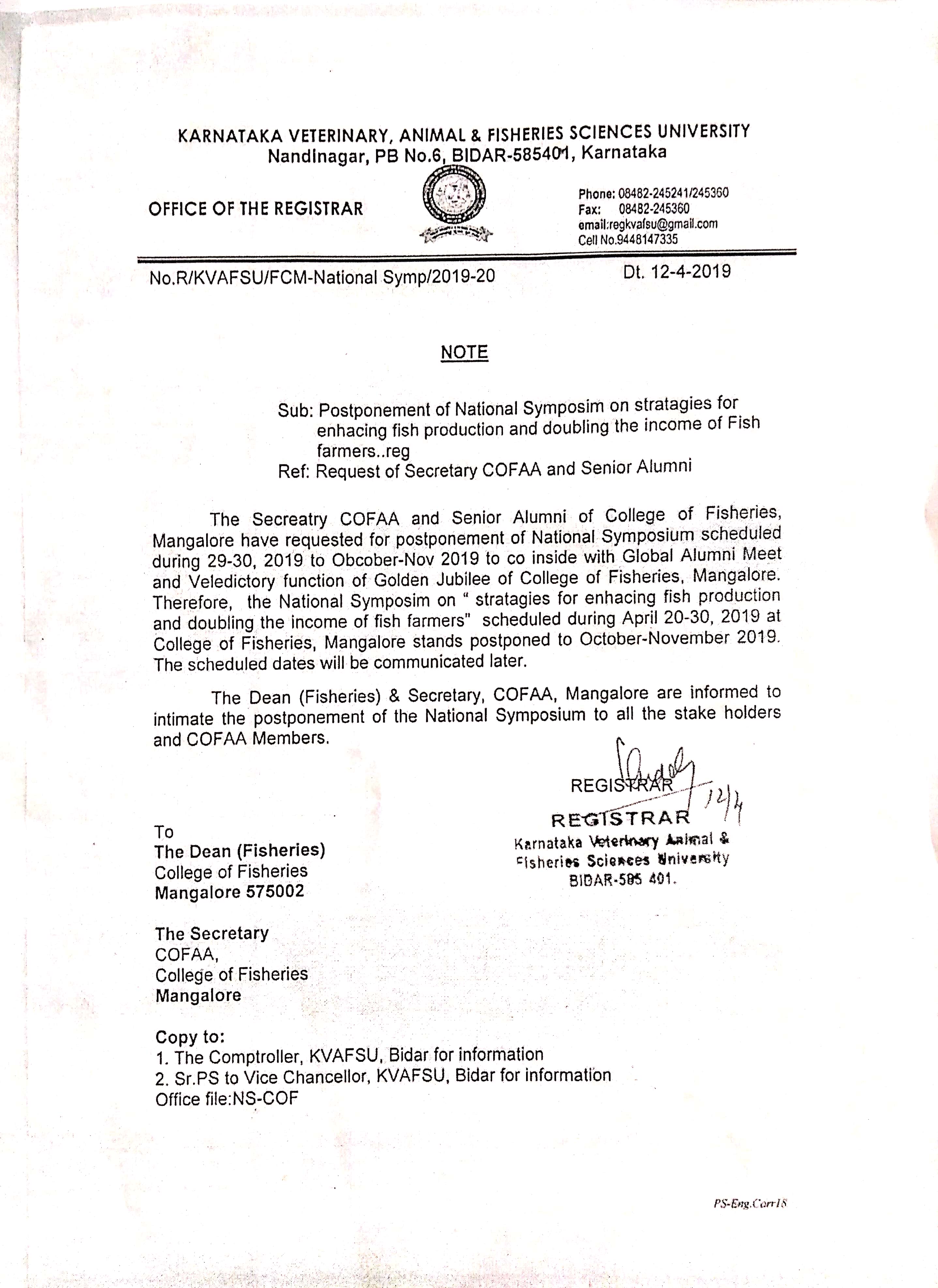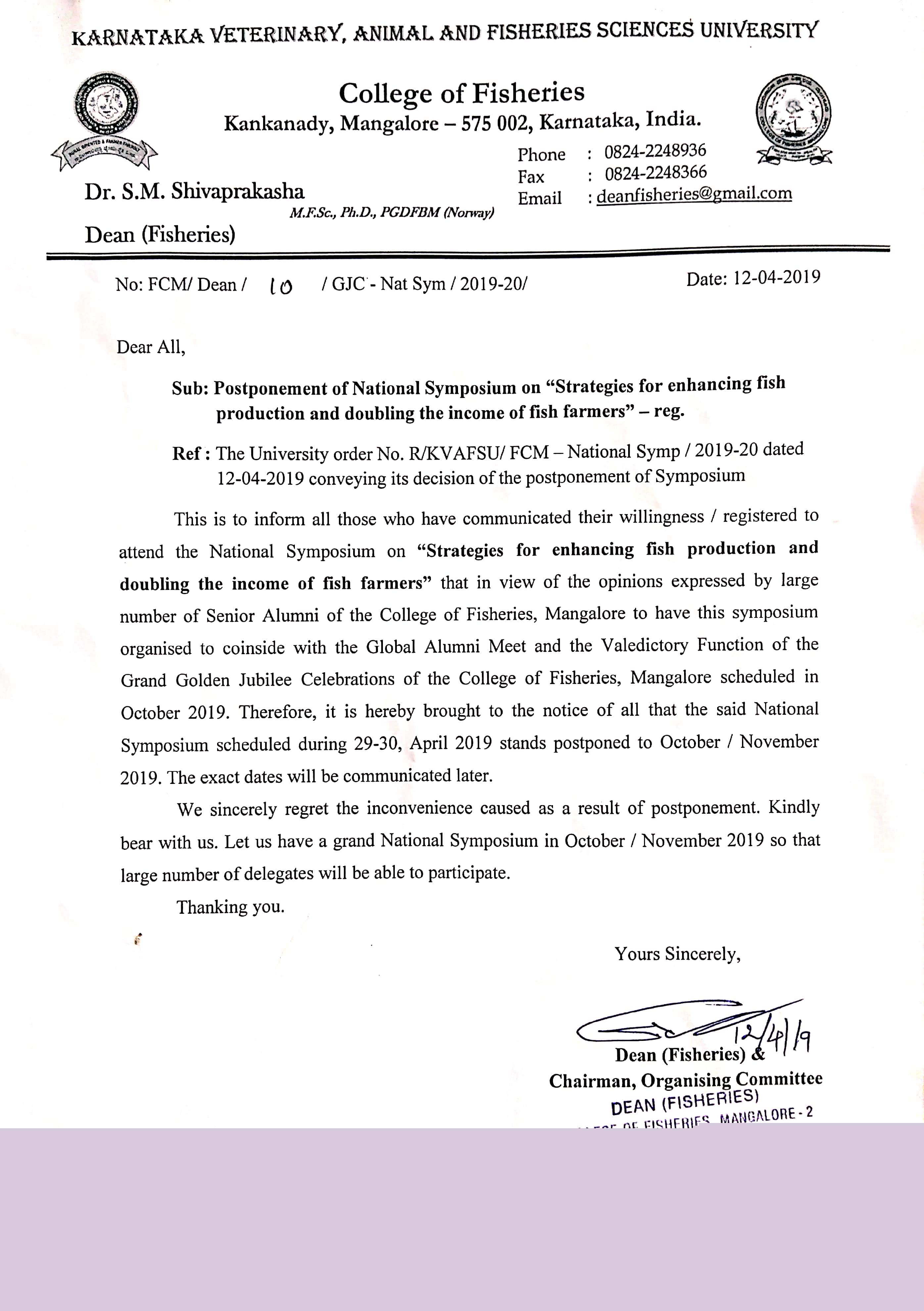 Postponement of National Symposium on "Strategies for enhancing fish production and doubling the income of fish farmers" This is to inform all those who have communicated their willingness / registered to attend the National Symposium on "Strategies for enhancing fish production and doubling the income of fish farmers" that in view of the opinions expressed by large number of Senior Alumni of the College of Fisheries, Mangalore to have this symposium organised to coincide with the Global Alumni Meet and the Valedictory Function of the Grand Golden Jubilee Celebrations of the College of Fisheries, Mangalore scheduled in October 2019. Therefore, it is hereby brought to the notice of all that the said National Symposium scheduled during 29-30, April 2019 stands postponed to October / November 2019. The exact dates will be communicated later. We sincerely regret the inconvenience caused as a result of postponement. Kindly bear with us. Let us have a grand National Symposium in October / November 2019 so that large number of delegates will be able to participate. Note 1 (University)Note 2 (Dean Fisheries) |