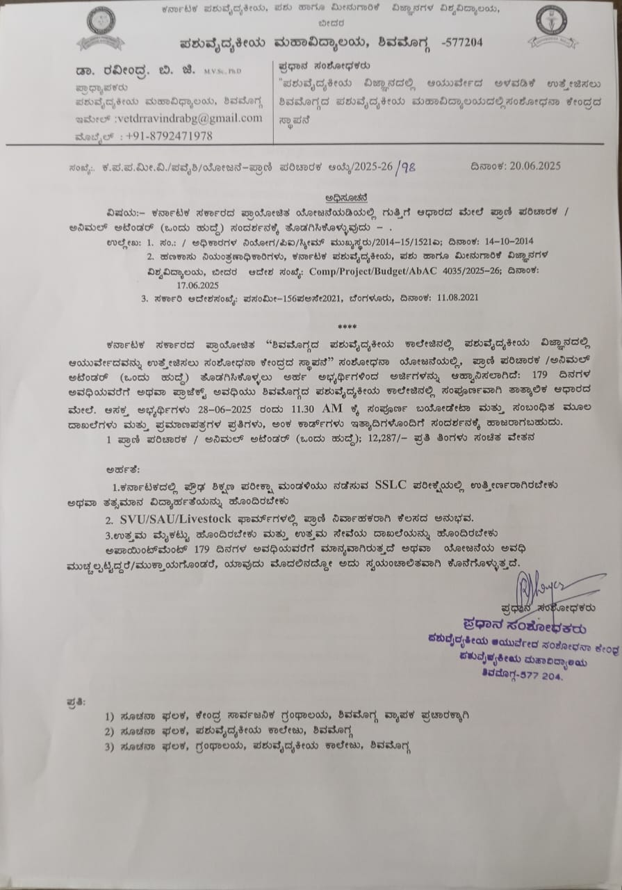 ಕರ್ನಾಟಕ ಸರ್ಕಾರದ ಪ್ರಾಯೋಜಿತ ಯೋಜನೆಯಲ್ಲಿ ಗುತ್ತಿಗೆ ಆಧಾರದ ಮೇಲೆ ಪ್ರಾಣಿ ಪರಿಚಾರಕ / ಅನಿಮಲ್ ಅಟೆಂಡಂಟ್ (ಒಂದು ಹುದ್ದೆ) ಸಂದರ್ಶನಕ್ಕೆ ತೊಡಗಿಸಿಕೊಳ್ಳುವುದು
