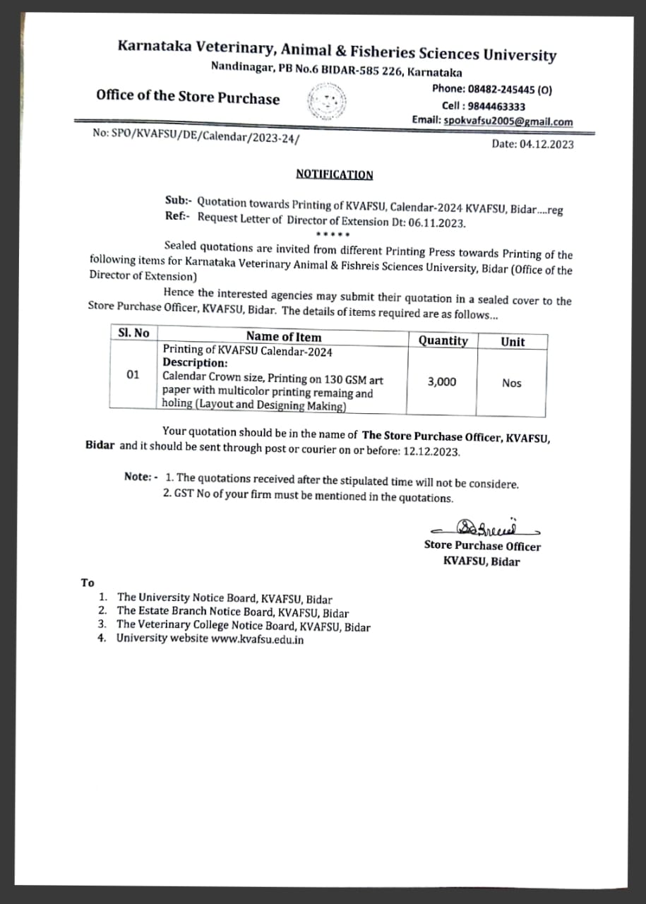 Quotation Towards Printing Of KVAFSU, Calender-2024 KVAFSU,Bidar