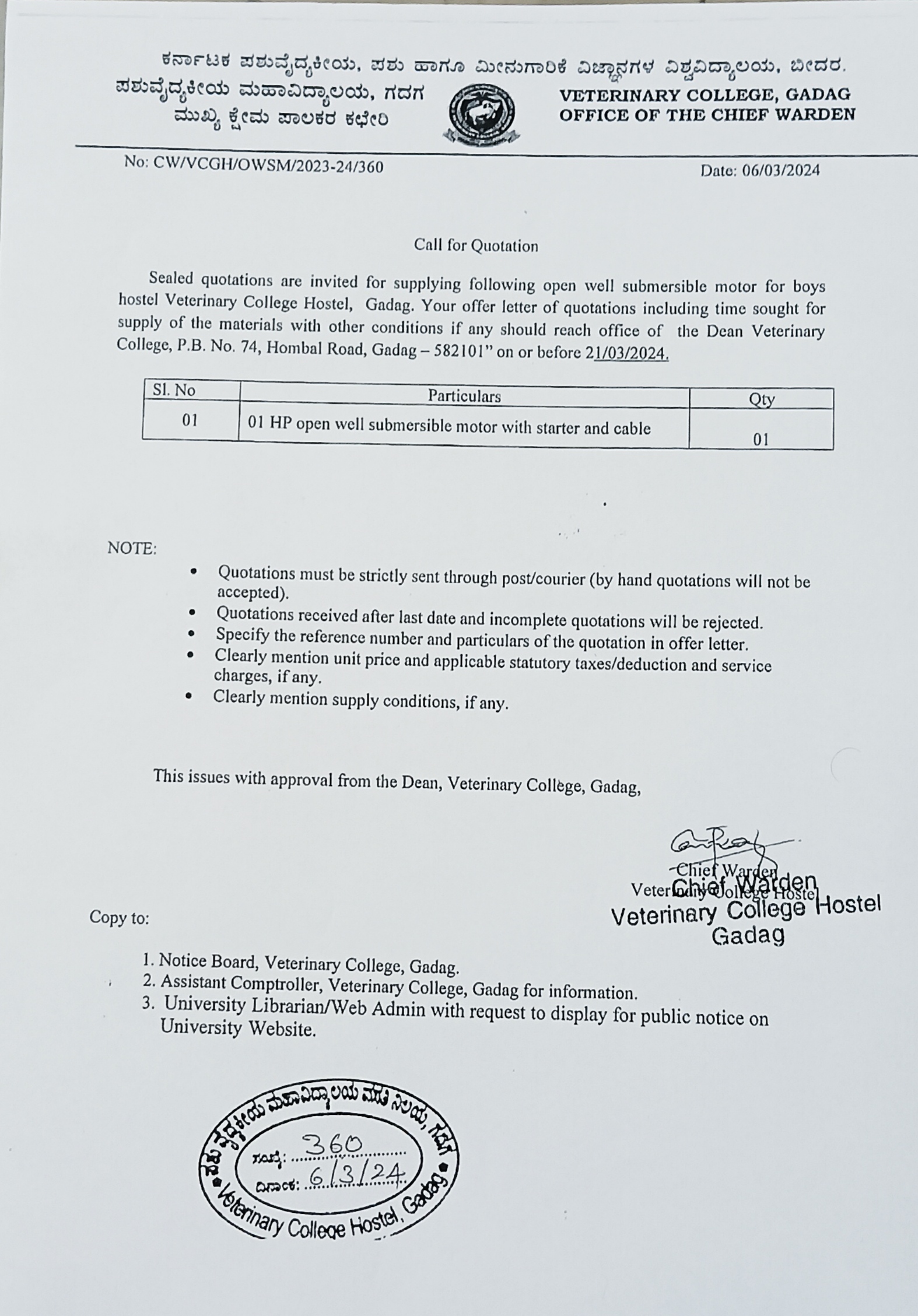 Quotation Towards For Supply of Miscellaneous Items at Veterinary College Bidar
