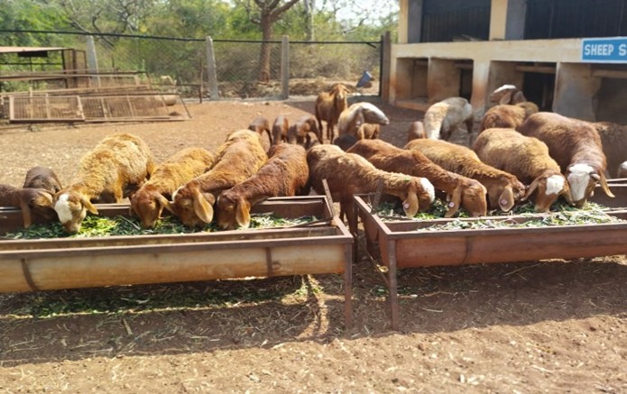 The unit is having two separate housing systems for Sheep and goats. The slatted floored elevated housing with a capacity for 50 sheep with open area and cement floored housing system with open area is available for 25 goats is available. The Osmanabadi, Sirohi, Barbari and Bidri goats and Kenguri sheep breed is maintained.3. Poultry unit